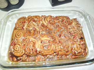 Next sprinkle the cinnamon sugar mixture (sorry no pictures, was in a rush) and roll the dough. Cut into 15 pieces and place into baking dish. (if you don't plan on baking right away just cover and place in refrigerator).